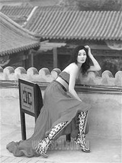 這里是古老的北京,被包圍得如同衣袋里的手帕,屋頂?shù)耐咂懽兂汕嗌驮鹿馐念伾。就是在這里,張曼玉套上巴黎世家、普拉達(dá)、迪奧和Balmain,正在自如地演繹模特的角色。她雀躍地穿著飾有羽毛的中式領(lǐng)少女裙裝,蝴蝶夫人式套裝,少婦束腰外衣。這位著名演員的形象呈現(xiàn)出一種糅合了優(yōu)雅、嚴(yán)肅與狂野的風(fēng)格。很難給她歸類,她拍過75部電影,精通所有的電影類型。