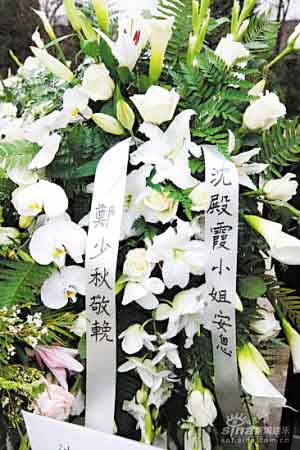 據(jù)悉,肥姐靈堂屬西式布置,十分簡(jiǎn)潔莊嚴(yán),靈柩全封,不設(shè)瞻仰遺容儀式。喪禮由岳華任司儀,欣宜致辭。肥姐的西式淺啡色靈柩擺在堂前中央位置,后面背景全是花圈,秋官的花圈也在花堆中并非在顯眼位置,靈柩上面則擺著欣宜敬挽的白玫瑰及白蝴蝶蘭花圈。其后,鄭欣宜與約30、40位近親好友為肥姐守夜,儀式約兩個(gè)小時(shí)。
