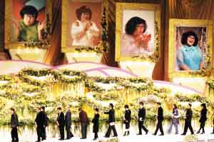 追思會會場耗資百萬布置得金碧輝煌,上方是四個方向的轉(zhuǎn)播屏幕,舞臺上用金色綢布與香檳玫瑰組成,懸掛著肥姐5張生前各個時期的巨幅照片。舞臺前面寫滿悼詞的牌子林立,悼念排后是一架三角鋼琴,以及寫有“肥姐,我們永遠(yuǎn)想念您”字樣的花圈。而臺下嘉賓席的正中央,也有數(shù)列座位擺上了整齊的花圈,足足延綿十幾米長。