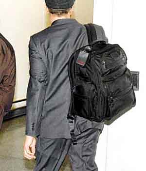 萊昂納多戴上黑色帽、身穿黑色西裝,背一個(gè)黑色背囊,急步離開(kāi)。