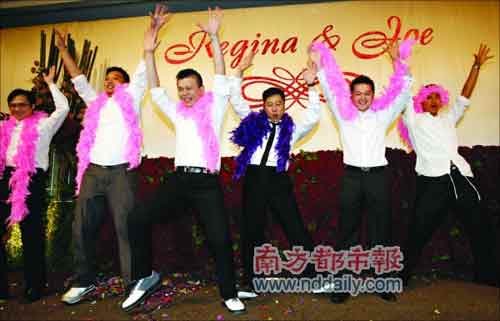 而新郎馬偉豪為了這場(chǎng)婚禮花了不少心思,除了以電影的形式記錄戀愛過程外,還瞞著新娘專門和兄弟們排演了一場(chǎng)“艷舞”在婚宴上表演,就為給新娘一個(gè)大大的驚喜?粗靶●R哥”在臺(tái)上扭腰挺胯搔首弄姿做出一個(gè)個(gè)“嫵媚”的姿勢(shì),新娘和嘉賓都笑得前仰后合。這場(chǎng)婚宴從晚上6點(diǎn)半一直持續(xù)到深夜近12點(diǎn),賓主才盡興而歸。