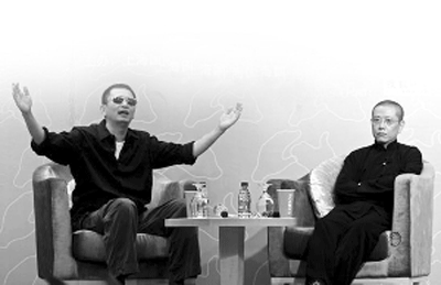 昨天的這個論壇雖是王家衛(wèi)主持,但是他幾乎把所有時間留給陳丹青,自稱自己欽佩陳丹青多年,甘當配角。但是陳丹青卻一點也不給他面子。兩位大師一上臺,記者們就紛紛拍照,閃光燈閃成一片。誰料,陳丹青剛跟大家問過好,就指著王家衛(wèi)說:“我是被他綁架來的!彼又V苦道,“坐在這臺子上,我不能抽煙。我一不抽煙智商就下降一半。雖然我知道抽煙不好。現(xiàn)在你們還不停拍我,我都快說不出話來了!闭劻艘粫惖で嗤蝗挥謥砹司洌骸敖裉煳液玫姑,先是被綁架來,現(xiàn)在發(fā)現(xiàn)襪子沒穿好,襪子幫太短,我不能把腿蹺著坐,老這樣端端正正地坐著,真累!”