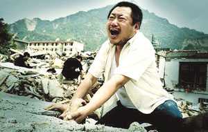 劇照中,范偉拉著“家人”的手哭喊。他表示,自己沖上那片廢墟以后一下就不能自拔了,然后在拼命刨廢墟,很快手就被磨爛了,但他自己當(dāng)時(shí)根本沒有感覺。