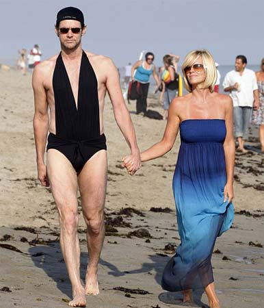 據(jù)臺灣“聯(lián)合報”報道,趁著假日,金·凱瑞和女友珍妮·麥卡錫手牽手在馬里布海灘享受日光浴。曾是“花花公子”模特兒的珍妮·麥卡錫一襲V字型泳衣,吸引不少人的目光。兩人隨即消失一陣,沒多久,金·凱瑞和珍妮·麥卡錫又出現(xiàn)在沙灘上,珍妮穿著再平常不過的露肩洋裝,但金·凱瑞身上竟然是珍妮剛才穿過的黑色V字型泳衣,引來一陣騷動與爆笑。