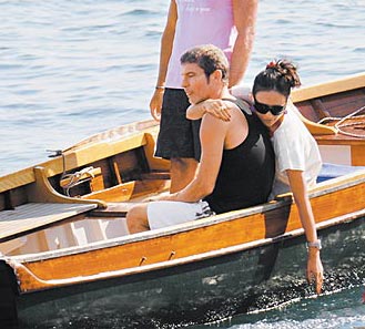 章子怡靠在船舷邊撥水,右手仍緊攬男友。