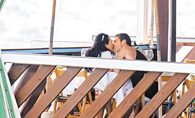 章子怡身穿白上衣和花色短褲,和未婚夫腳踩情侶人字拖,一派輕松地在水上餐廳用餐,席間有說有笑,她還拿相機(jī)朝男友猛拍,并伸手搭上他的肩,2人當(dāng)眾熱吻。