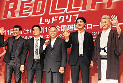 左起:張震、梁朝偉、吳宇森、金城武及中村獅童等,昨日現(xiàn)身日本出席《赤壁》記者會(huì)。