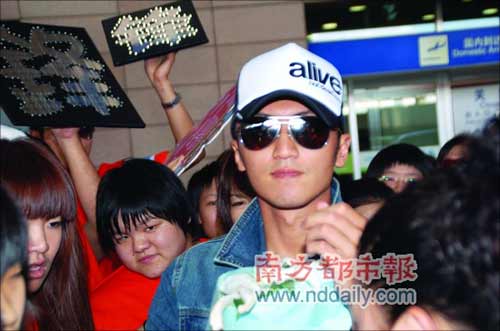 8月9日,謝霆鋒忙完北京的活動,馬不停蹄地趕到上海,為奧運錄制節(jié)目。機(jī)場大批歌迷守候,謝霆鋒頭戴alive棒球帽,大墨鏡加上一身的牛仔服,顯得十分引人注目,一出現(xiàn)就吸引了大批粉絲圍上前。