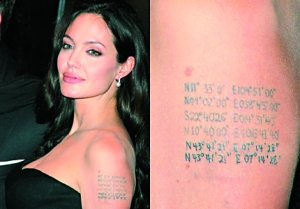 近日安吉麗娜·茱莉在新片《調(diào)包嬰兒》紐約首映禮時曝光了手臂上的新文身。記者仔細(xì)辨認(rèn)才發(fā)現(xiàn)原來茱莉把她那雙胞胎孩子諾克斯與薇薇妮出生地的經(jīng)緯度都刻在上面,目前,該手臂已收錄其6個子女的出生地經(jīng)緯度。有媒體戲稱,茱莉的孩子來自五湖四海,弄得她自己都不記得了孩子從何而來,因此才把這些資料刻在手臂上,時刻提醒自己。