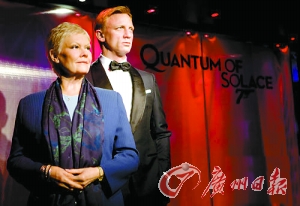 10月15日,倫敦,丹尼爾·克雷格版“邦德”蠟像、老牌女星戴·朱迪·丹奇蠟像進駐杜莎夫人蠟像館!鞍畹隆蔽餮b革履瀟灑帥氣,英俊有型電力超強,宛如真人在場。