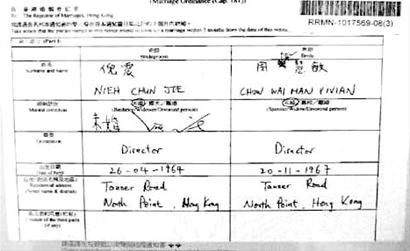 倪震發(fā)表結(jié)婚聲明之事震驚娛樂圈,19日,有記者在金鐘婚姻登記處發(fā)現(xiàn),12月18日(倪震宣布婚訊當日)的“婚姻監(jiān)禮人”項目上,有一封填有倪震及周慧敏姓名的擬結(jié)婚通知書,兩人出生日期分別是26-04-1964及20-11-1967,職業(yè)一欄同時寫著“Director”(主管),住址則填報位于北角的寓所。
