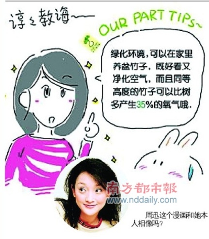 周迅日前推出“周粥”合作———和國內(nèi)當(dāng)紅漫畫家胖兔子粥粥合作漫畫專欄,推廣環(huán)保意識。