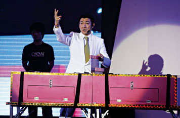 劉謙變魔術,那是他的老本行,而劉德華就純粹是客串了,但在舞臺上的一招一式,劉德華倒并不業(yè)余。第一個魔術請出了他的“女朋友 ”:“她是我今天的女朋友哦。”邊說邊摸著美女的手,“為了公平起見,我要邀請媒體朋友一起來參與!薄斑有你,美女,我喜歡漂亮的……”還沒開始變魔術,之前的噱頭已擺得夠足!皩⒚琅P在盒子里,用鋒利的刀等工具往下插,然后盒子分離,人也就此被分尸……”表演內容并不陌生,但出自華仔之手,粉絲們看得津津有味,尖叫聲不斷!華仔究竟用了多少時間學會變這個魔術的呢?“這個是秘密,不能告訴你們。”故作神秘的華仔透露說,自己曾經(jīng)上過劉謙的節(jié)目,也跟他學了幾招。