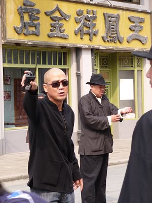 根據(jù)劇組的通告,昨日《建國大業(yè)》劇組從早晨6點(diǎn)30分就開工拍攝。當(dāng)早報(bào)記者于中午時(shí)分趕到車墩時(shí),導(dǎo)演黃建新正在“拍兩個(gè)不知名人士的戲份”,不見“蔣介石”的扮演者張國立,但劇組人員保證“張國立今天來了片場”。下午2點(diǎn),劇組午休時(shí)間結(jié)束。“南京路”上忽然多出了一群黑衣黑帽、幫派打扮的群眾演員。同時(shí),一輛車輪外側(cè)被涂成金色的“另類”黃包車也出現(xiàn)在“南京路”的一頭。幾分鐘后,現(xiàn)場忽然一陣騷動(dòng),許多原本在附近休息的游客都涌向了“南京路”口,拿出相機(jī)拍個(gè)不停。原來是“杜月笙”馮小剛出現(xiàn)了。同時(shí),還有一個(gè)光頭、戴著墨鏡、手執(zhí)大喇叭的男子,在給馮小剛以及現(xiàn)場的群眾演員安排走位。仔細(xì)一看,這位“現(xiàn)場導(dǎo)演”不是別人,正是“蔣介石”張國立。原來整個(gè)上午,張國立并沒有休息,而是呆在劇組在片場臨時(shí)設(shè)置的工作室內(nèi),和另一位導(dǎo)演韓三平一起,看之前拍攝的回放。