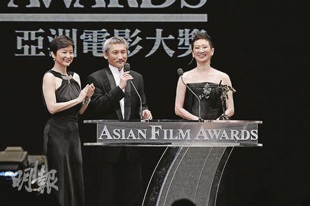 徐克與施南生手拖手出場,部分嘉賓站立拍掌。徐克在臺上懷念一班已故電影人,他說:“25年前的3月23日,正是我與施南生構(gòu)思成立電影工作室的日子!贝藭r,臺下的吳宇森大聲喝彩。徐克與施南生從林青霞手上接過獎座后,互相親臉祝賀。
