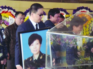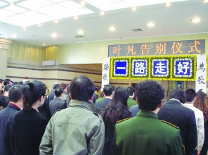 昨天的追悼會現(xiàn)場不但來了很多葉凡生前的好友,也來了不少葉凡生前的戰(zhàn)友,據(jù)武警文工團政委尚力峰介紹,“當聽說葉凡去世的消息后,所有和她合作過的戰(zhàn)友都驚呆了,我們都不知道她的病情居然那么嚴重,她沒告訴我們,是不想讓我們操心。∫驗槲渚墓F即將要有幾個大型的演出,所以戰(zhàn)友們不能全來,但他們送上了花圈表示哀悼。葉凡在我們團是出類拔萃的臺柱子,大型晚會不能少了她,她平時對自己要求十分嚴格,對于創(chuàng)作也是一絲不茍。有一次某地發(fā)生洪澇災害,葉凡主動請求到一線演出慰問,并創(chuàng)作《真情永遠》。2003年非典時期,葉凡已經(jīng)得病,但她沒有說任何理由,再次主動要求參加創(chuàng)作,并寫出《天使的故事》,讓全團都為之感動。她也多次獲得過文化部一等獎,可以說現(xiàn)在正是葉凡最輝煌的時期,可她卻離我們而去,太可惜了!”