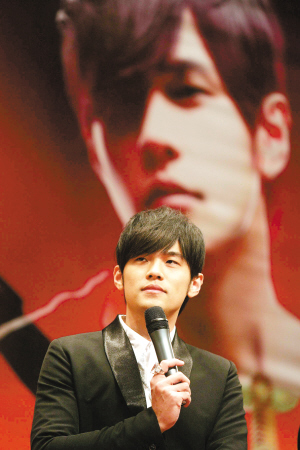 周杰倫在現(xiàn)場(chǎng)把首張VIP門票送給了新晉世界小姐張梓琳。記者 郭延冰 攝