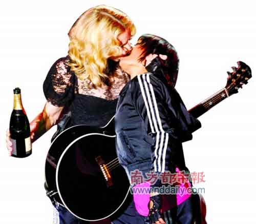 法國當(dāng)?shù)貢r間5月6日,麥當(dāng)娜(Madonna)在巴黎奧林匹亞劇院為自己的新專輯《HardCandy》做宣傳,并舉行小型演唱會。數(shù)千名忠實粉絲夾道歡迎,并打出“NRJloveMadonna”的標(biāo)語(NRJ為法國著名的音樂頒獎禮)。娜姐在演出中不但賣力地又唱又跳,還輕松地喝起酒來,唱到high時更挎著吉他拿著酒瓶,與一位伴舞的女演員當(dāng)眾親吻,大玩“斷背”,引得臺下無數(shù)歌迷尖叫連連。