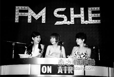 距離上一張《PLAY》專輯已經(jīng)過了將近1年半,即使唱片市場越來越不景氣,但《FMS.H.E》的臺(tái)灣預(yù)購量還是沖到了4.2萬張,讓S.H.E又驚又喜。前日在重金打造的豪華旋轉(zhuǎn)DJ臺(tái)上,身著美麗小禮服的S.H.E三人,不僅聲音悅耳,身材也讓大家驚艷,可惜播報(bào)新聞時(shí)輪流吃了幾次螺絲,把嚴(yán)肅的新聞報(bào)得笑果十足(見右圖)。事后她們?nèi)滩蛔舌?“舞臺(tái)正前方的聚光燈太強(qiáng)了啦,讓我們看不清楚稿子,平常錄電臺(tái)節(jié)目時(shí),并不會(huì)這樣的嘛。”