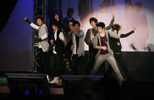 站在臺上的SJ-M7個成員,不時的互相交頭接耳,韓庚、始源的竊竊私語,東海、Henry的勾肩搭背,都成了令現(xiàn)場粉絲尖叫聲此起彼伏的導火線。