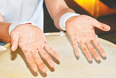 中新網(wǎng)3月24日電 吳尊上月底在香港紅館的“飛輪!毖莩獣,因吊鋼絲時發(fā)生意外,左腳板的左側(cè)骨出現(xiàn)1道裂痕,不能跳舞的他昨特別為本周六的馬來西亞演唱會排練打戰(zhàn)鼓,結(jié)果他為練鼓而導致雙手多達11處破皮傷口,他苦笑說:“我的腰也因使力不當而肌肉拉傷。”