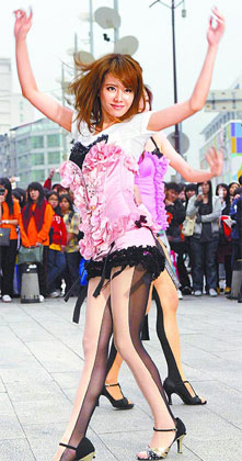 中新網(wǎng)3月28日電 蔡依林(Jolin)昨日(27日)在西門町封街拍新歌《花蝴蝶》舞蹈教學示范帶。Jolin身穿粉紅馬甲、黑色蕾絲邊粉紅小熱褲,腳上已舍棄美美高跟鞋,改以專業(yè)的國標舞鞋上陣,只為了避免腳踝舊疾復發(fā)。
