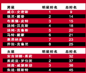 今年《諜影重重3》叫好又叫座,讓馬特·戴蒙身價(jià)5級(jí)跳,從去年26名躍登今年21名。女星方面妮可·基德曼、蕾妮·茲薇格今年都沒擠進(jìn)前50名。