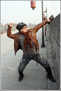 一身嬉皮風(fēng)格的裝扮,加上一副超大的黑框眼鏡,彭波看上去帶有明顯的“謝小盟后遺癥”。雖然只來(lái)過(guò)西安兩次,但彭波非常喜歡西安。去年在西安拍了一個(gè)多月電影,他已把城里好吃好玩的地方摸了個(gè)門兒清。他說(shuō):“好吃的太多,滿街都是美女。西安人爽快、實(shí)在,在這交了不少朋友,國(guó)力隊(duì)的江洪就是我哥哥。我已把這里弄得跟自己家一樣了,到處都特別熟。”