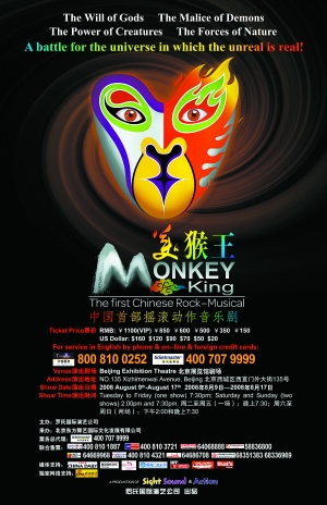 定位為搖滾動作音樂劇,又要與中國傳統音樂元素相結合,羅啟仁說到音樂上的特點很興奮:“《美猴王》的音樂創(chuàng)作者周佼佼很年輕,作為奧運會期間首演的大劇用一位學生級的作曲,很多人不能認同。我不認為年輕不行,我有我的勇氣。因為搖滾是年輕人的范圍,如果找一位很大年紀的人來弄搖滾,是‘搖’不出來的。音樂是中國類型的搖滾,是特別新鮮的,西方都沒有這類的作品。吉他和琵琶的二重奏、與古箏的二重奏等,還有美聲的唱法,大概十首歌,聽起來很不錯!