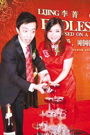昨早10時,郭德綱、于謙、小何、春妮等應邀前來。郭德綱和于謙默契地以“白T恤蹭花了”的服裝出現,頗為喜氣。他更在留言板上題詞“真是太刺激了。 碑斕旎檠绲闹鞒钟晒戮V擔當,他表示自己很少主持此類婚宴,但臺上與新郎李菁一唱一和的搭檔風趣幽默,令在場所有嘉賓開懷不已。他更形容新娘“五大三粗”語含深意,據知情人透露,新娘極有可能已經懷孕。