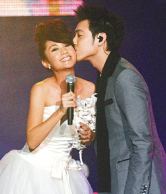 中新網(wǎng)12月22日電 偶像劇“不良笑花”風(fēng)光下檔,楊丞琳昨晚在慶功演唱會披婚紗,化身劇中角色“蔣小花”,和屏幕情侶潘瑋柏合唱“今天你要嫁給我”,潘帥主動求婚、作勢獻(xiàn)吻,現(xiàn)場上千位歌迷作見證,鼓噪兩人“親下去”、“舌吻”,無奈楊丞琳不領(lǐng)情,害羞撇過頭去。