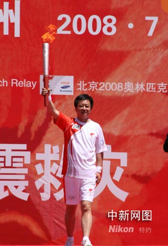08年7月7日,奧運(yùn)火炬在甘肅蘭州傳遞,中央電視臺著名節(jié)目主持人朱軍在自己的家鄉(xiāng)蘭州擔(dān)任最后一棒火炬手。記者周兆軍攝