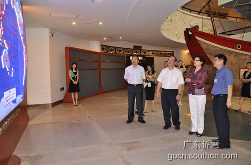 在博物館序廳,李海峰看到毛澤東在60年前為海外僑胞題寫的“僑胞們團結(jié)起來,擁護祖國的革命,改善自己的地位”題詞時,向館長王明惠了解毛主席題詞的時間和背景。在中庭看到粵籍華僑華人的世界分布圖后,就問起了粵籍華僑華人的人數(shù),吳銳成、林琳解答說有三千多萬。李海峰指出廣東的確是僑務(wù)大省。李海峰接著來到李炳源捐贈文物及館藏字畫展廳,充分肯定美國華僑李炳源在海外收購中國文物并捐贈給廣東華僑博物館的愛鄉(xiāng)之情。接著李海峰仔細參觀了“廣東華僑歷史陳列”主題展,認為這個展覽全面、系統(tǒng),陳展的實物和圖片、文獻資料都非常珍貴,其中很多圖片都是沒有見過的。