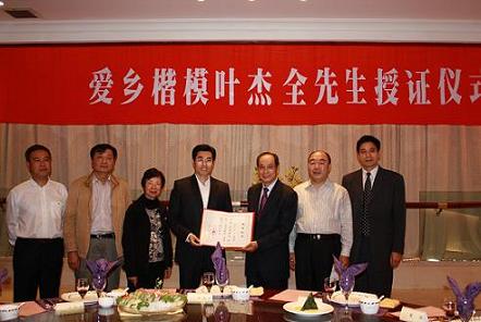 為表彰葉杰全先生重教興學(xué)、無償捐贈(zèng)的義舉,2007年10月,浙江省人民政府授予葉杰全“愛鄉(xiāng)楷!睒s譽(yù)稱號(hào)。(浙江僑辦 左新元)