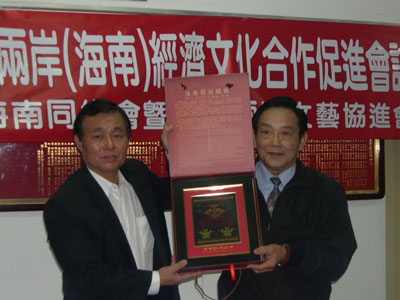 臺北市海南同鄉(xiāng)會理事長符子正親自會見并組織和主持了迎接訪問團一行的座談會,賓主雙方互贈禮品。