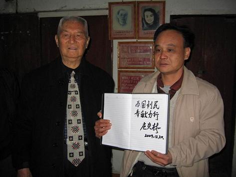 當天下午,年近九旬的莊炎林,不顧旅途的疲勞,在梧州市僑聯(lián)主席鐘小欣、蒼梧縣統(tǒng)戰(zhàn)部部長李燕芬等領(lǐng)導的陪同下,來到蒼梧縣石橋鎮(zhèn)中心小學考察。其中心小學是莊炎林先生在抗日戰(zhàn)爭期間,以教師身份掩護開展地下工作的地方。今日重游故地,莊炎林先生格外激動,并向陪同人員講起了當年的工作情景。隨后莊炎林先生一邊聽取該學校的情況,一邊參觀當年曾用過的工作室,并在留言簿上題詞:為國利民,奉獻力行。(蔡光天)