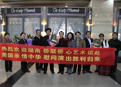 中新網2月11日電 據(jù)湖南省僑聯(lián)消息,經湖南省政府批準,由湖南省僑聯(lián)組團,湖南省僑聯(lián)、長沙市外事僑務辦公室、長沙市僑聯(lián)、開福區(qū)僑聯(lián)主辦,應美國有關僑(社)團的邀請,湖南省僑聯(lián)僑心藝術團于2010年1月23至2月8日,在紐約、洛杉磯、華盛頓、休斯敦、圣安東尼奧等城市“親情中華”赴美慰問巡演,圓滿成功,于2月9日載譽平安歸來。