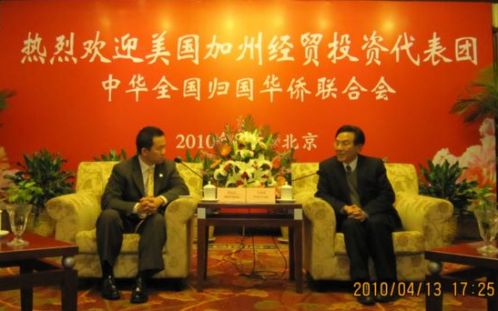 中新網(wǎng)4月14日電 據(jù)中國(guó)僑聯(lián)網(wǎng)站消息,4月13日,中國(guó)僑聯(lián)副主席王永樂(lè)在華僑大廈會(huì)見了以美國(guó)加州圣蓋博市市長(zhǎng)黃裕民為團(tuán)長(zhǎng)的加州經(jīng)貿(mào)及地產(chǎn)投資代表團(tuán)一行。