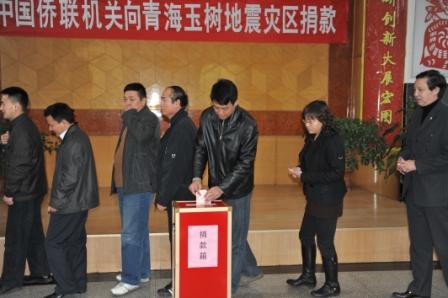 中國僑聯(lián)副主席李祖沛現場傳達了中共中央政治局委員、全國人大常委會副委員長王兆國對僑聯(lián)開展玉樹抗震救災的指示精神和林軍對玉樹抗震救災的批示精神,指出要把廣大歸僑僑眷和海外僑胞支援抗震救災的熱情引導并融入黨政主導的抗震救災行動中去,并號召機關廣大干部職工要大力發(fā)揚“一方有難、八方支援”的精神,心系災區(qū)、情系災民,以實際行動幫助災區(qū)群眾渡過難關。隨后,舉行了中國僑聯(lián)機關向青海玉樹地震災區(qū)捐款活動。中國僑聯(lián)黨組書記、主席林軍、副主席李祖沛、董中原、王永樂帶頭向災區(qū)捐款,出差在外的副主席喬衛(wèi)也委托他人捐款。