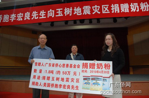 美國僑胞李宏良向玉樹地震災(zāi)區(qū)捐贈50萬元奶粉